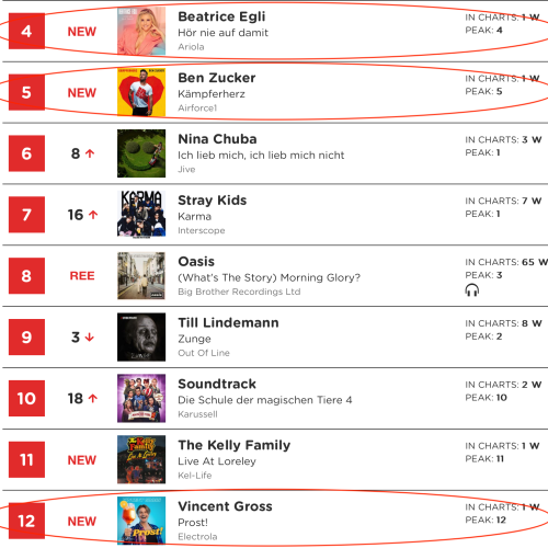 Knapp hinter den unüberwindbaren K-Pop Demon Hunters, Taylor Swift und Kool Savas landen die Alben "Hör nie auf" von Beatrice Egli und "Kämpferherz" von Ben Zucker. Platz 4 und 5 der deutschen Album Charts.